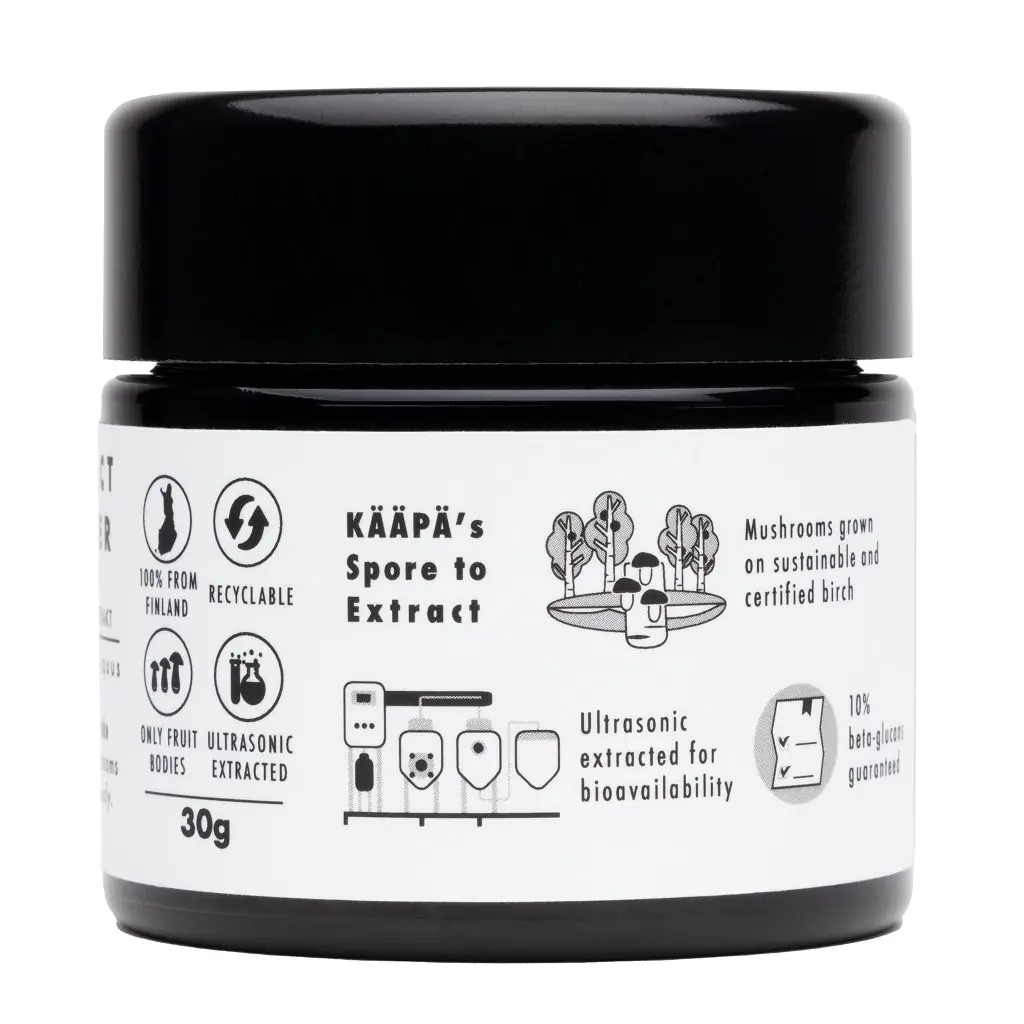 KÄÄPÄ Mushrooms Chaga Extract Poeder Bio is een hoogwaardig voedingssupplement dat is vervaardigd van 100% biologische chaga-paddenstoelen (Inonotus obliquus), ook wel bekend als berkenweerschijnzwam. Dit extract poeder van 30 gram onderscheidt zich door zijn Finse oorsprong en innovatieve extractiemethode die zorgt voor een optimale samenstelling van bioactieve componenten.