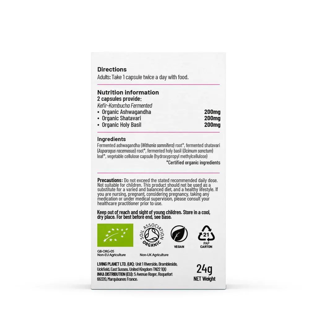 Elke dagdosering van 2 capsules bevat 200 mg gefermenteerde biologische ashwagandha wortel, 200 mg gefermenteerde biologische shatavari wortel en 200 mg gefermenteerd biologisch heilig basilicum blad. Deze evenwichtige verhoudingen zorgen voor een harmonieuze samenstelling waarbij de drie kruiden synergetisch samenwerken.