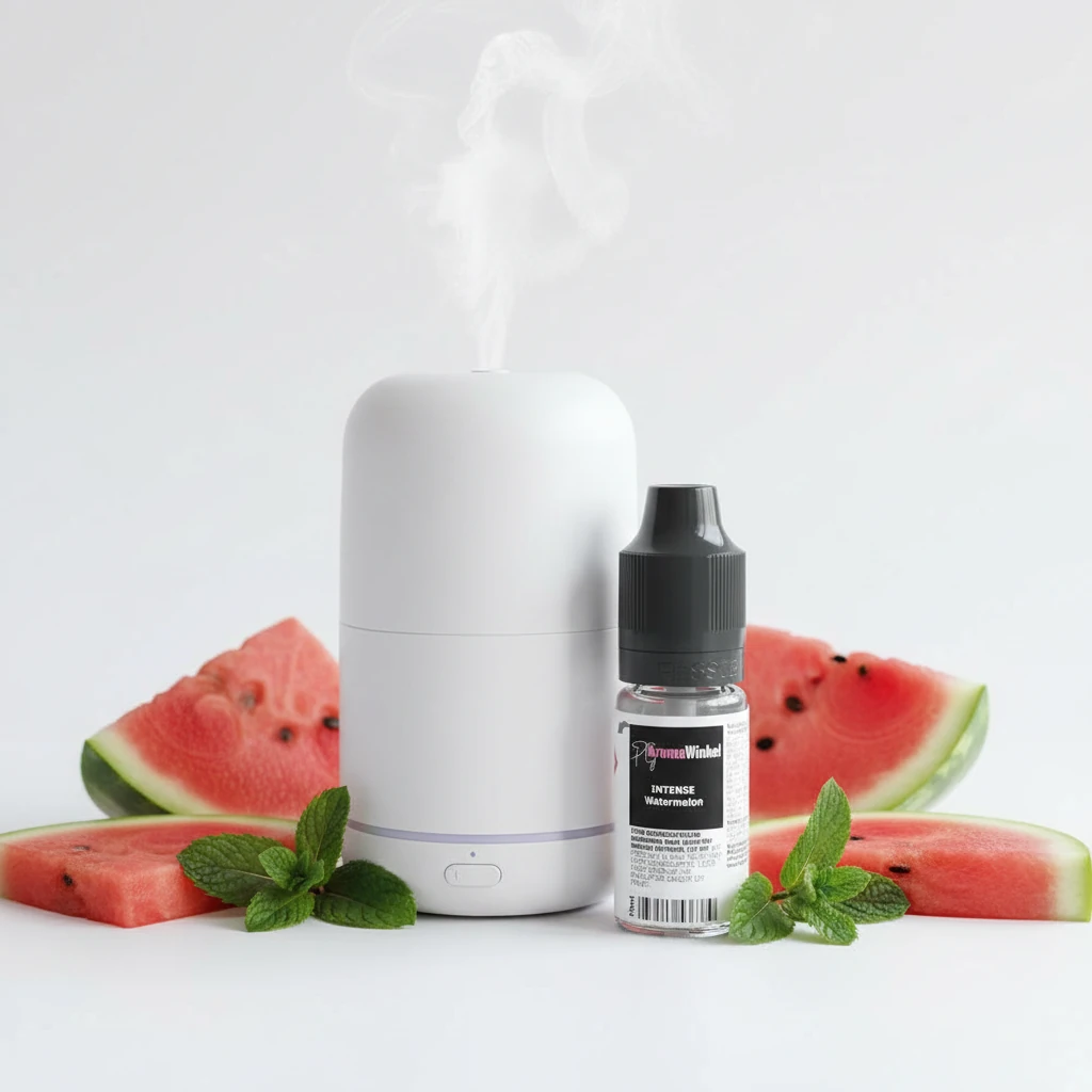 Bij het openen van het flesje ervaar je direct een heerlijke geur die herinneringen oproept aan zomerse dagen met rijpe, sappige watermeloenen. De geur is fris en uitnodigend, met een perfecte balans tussen de natuurlijke zoetheid van watermeloen en een koele, verfrissende mentholondertoon. Deze harmonieuze combinatie van watermeloen en menthol zorgt voor een unieke reukmix die zowel opbeurend als rustgevend werkt. De sappige en zoete geur van watermeloen wordt versterkt door de verkoelende, muntachtige toets van menthol, waardoor een verkwikkende geurervaring ontstaat.